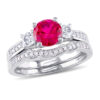 Simply stunning, this glistening bridal set is a beautiful beginning to the rest of your lives together. Shimmering in cool 10K white gold, the engagement ring features a dazzling 6.0mm bright red ruby flanked by a pair of smaller created white sapphires. Sparkling pav??-set diamonds adorn each side of the tapered shank for a look she can’t help but admire. On your special day, a coordinating contoured diamond-lined wedding band completes this significant expression of your love. Radiant with 1/8 ct. t.w. of diamonds and a brilliant buffed luster, this bridal set is everything she imagined and more.