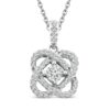 This enchanting diamond necklace serves as a beautiful reminder that through life's twists and turns, love keeps you centered. Featuring a stunning round center diamond and surrounded by an interwoven swirling design of diamonds, the pendant has a total diamond weight of 1/10 carat. The pendant is crafted of sterling silver and hangs on an 18-inch cable chain that secures with a spring ring clasp.